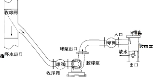 各管路和彎頭的安裝按圖1進(jìn)行。收球網(wǎng)的出膠球口必須高于膠球泵人口0.5m及以上;各接口有彎頭過渡連接的,彎頭要大于或等于90。彎徑好大于2.5倍管徑。